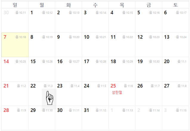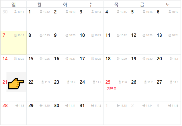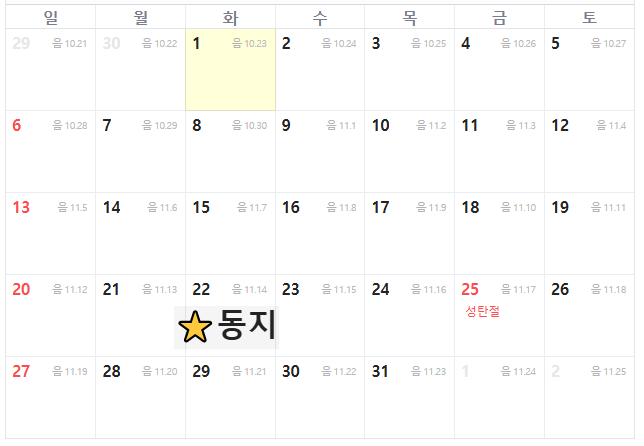 달력을 살펴보면, 2025년 동짓날은 음력 11월 3일이라는것을 알 수 있습니다.