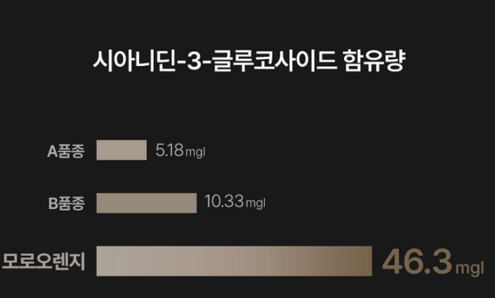 C3G란? 안토시아닌(cyaniding-3-0-glucoside)의 약자로 이탈리아 시칠리아 동부에서 자라는 블러드 오렌지의 핵심성분으로 자유라디컬을 중화하여 산화 스트레스를 줄이는데 도움이 되는 성분으로 알려져 있다. 또한 모로 오렌지는 타 품종 대비 C3G가 최대 8배 들어있다고 한다.