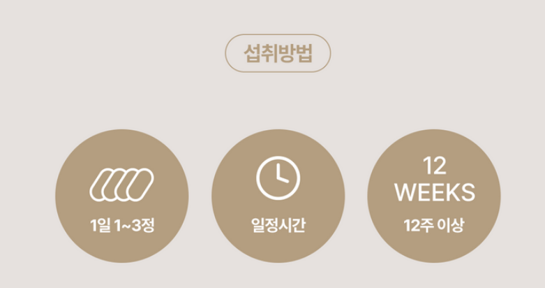 - 1일 섭취 횟수 : 하루에 1~3회 번 섭취 12주 이상 꾸준히 먹는 것이 중요!