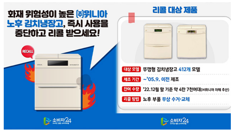 - 위니아 김치 냉장고의 잦은 화재로 인해 위니아 제조사와 정부에서 무료로 점검 및 수거가 가능하다고 발표했지만, 아직도 여전히 가정에서 4만 7천대(23년 기준) 이상의 김치냉장고가 사용되고 있다. 또한 위니아에서 3년째 리콜하고 있으며 가정에서의 사용을 중단하거나, 점검을 받아야 한다고 발표했지만 잘 모르는 분들이 많기 때문에 이로 인한 화재가 지속적으로 이어지고 있다.