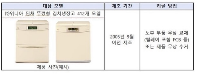 ◆ 위니아 딤채 김치냉장고 리콜 대상 제품