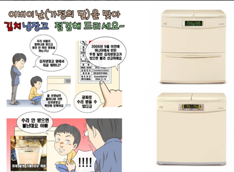 - 화재가 일어나는 이유는 김치냉장고의 노후된 작은 부품하나가 원인인데, 무상점검을 신청하면 수리기사가 방문해 냉장고 먼지 청소를 비롯한 화재원인이 되는 부품을 무료로 교체해 준다.(출장비 무료) 하지만, 이왕이면 사용하지 말고 무상수거를 하는 것을 추천한다.