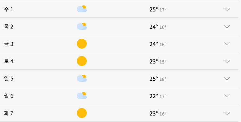 | 낮기온 | 23도~27도 사이+ 햇살강한날은 조금 더울수도 있음 |